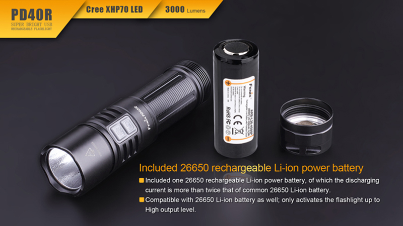 Fenix PD40R is super bright USB rechargeable Cree XHP70 LED Flashlight , it is powered by a 26650 rechargeable power battery, which activates the maximum output of 3000 lumens and extends the runtime dramatically.