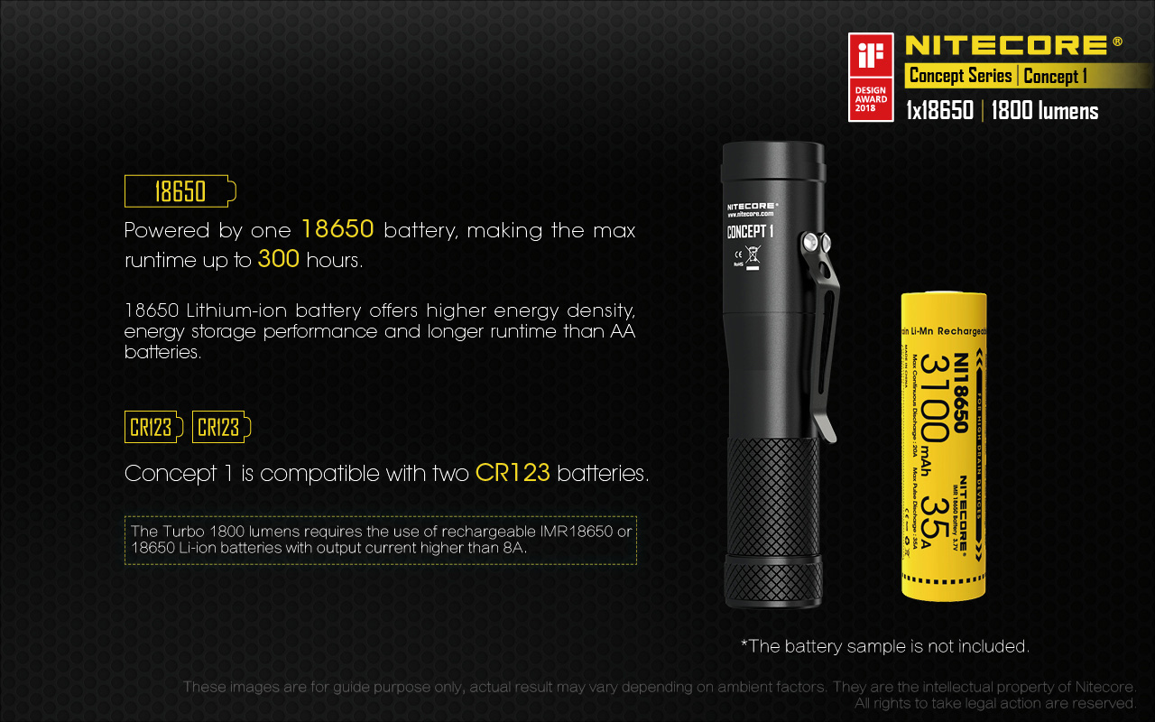 Turbo: 1800 lumens / 30 min ( *IMR 18650 )