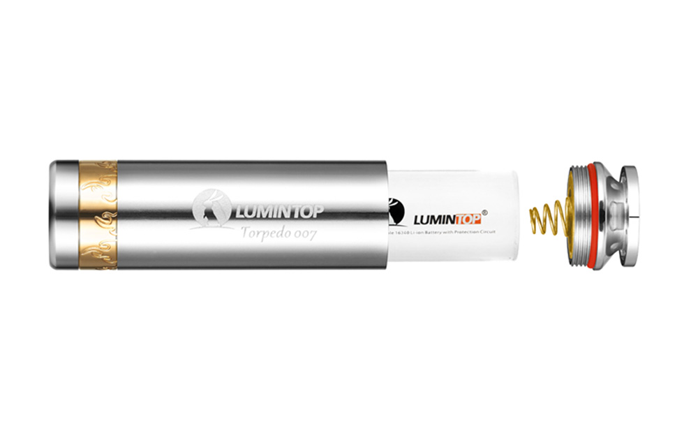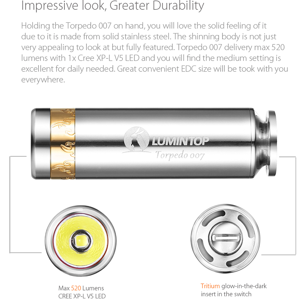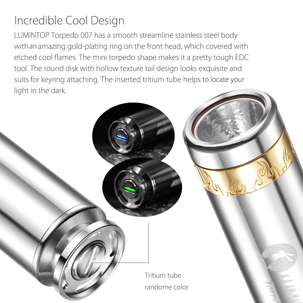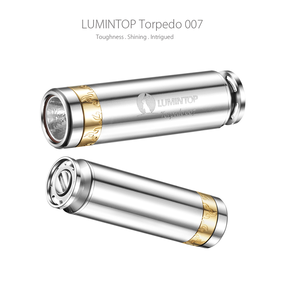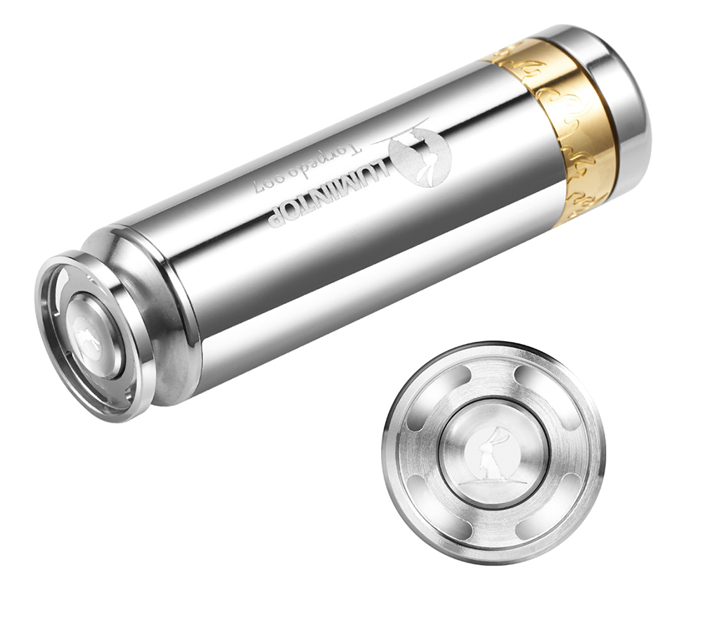 LUMINTOP torpedo 007 Luxury Gift EDC flashlight has the smooth streamline stainless steel tube body, decorated with golden wild flame circle. This portable Mini flashlight attracts you as a miniature torpedo which will let you fall in love with it at first sight.