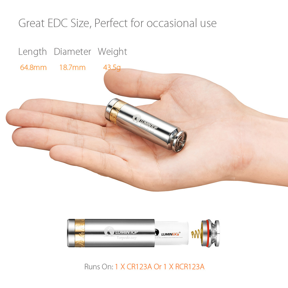 With length in 64.8 mm , only the size of a palm, Lumintop Torpedo007 is easy to hold it in a hand which also can be well hidden. Its weight is less than 50g it is very small and light for everyday carry. Optimized ultra-precise reflector and double-side AR coated lens which resists impact and thermal shock, offer a more comfortable cool beam of Cree XP-L V5 LED. The comfortable clicky tail switch is very Convenient For One-Hand Operation. Only a single CR123 (or RCR123) battery is needed to turn on Torpedo007, 4 modes from Low -Mid- High - Moonlight Mode. The moonlight mode in 0.5 lumens could run 25 days. And the inner copper tube body provides a better heat dissipation. Intelligent advanced temperature regulation system allows it to adjust output performance according to its body temperature to ensure stable and safe operation.Torpedo007 could be tail stand makes it looks like a beautiful silver candle. With eye-catching tritium in the tail button, you could locate your light in the dark easily. Lumintop Torpedo007,a flashlight with so many excellent and practical function, not only can meet the needs of your daily, also is your good choice of collection and gifts .So what are you waiting for? Come and bring it home!