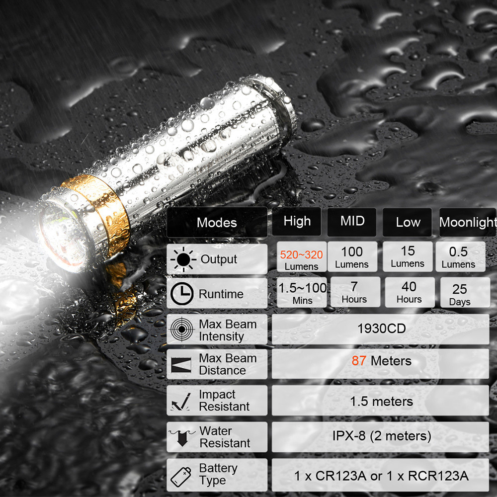 High: 520~320lumens/(1.5 Minutes+ 100 Minutes), Mid: 100lumens/7hours, Low: 15lumens/40hours, Moonlight Model: 0.5lumens/25 Days